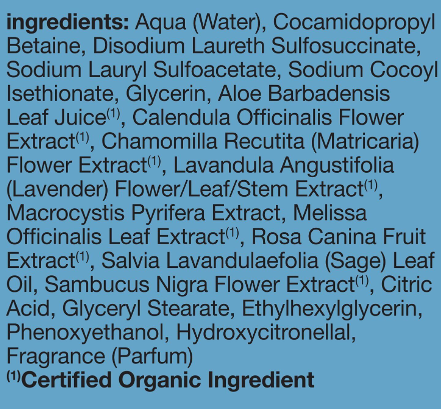 | Aqua (Water), Cocamidopropyl Betaine, Disodium Laureth Sulfosuccinate, Sodium Laureth Sulfoacetate, Sodium Cocoyl Isethionate, Glycerin, Aloe Barbadensis Leaf Juice(1), Calendula Officinalis Flower Extract(1), Chamomilla Recutita (Matricaria) Flower Extract(1), Lavandula Angustifolia (Lavender) Flower/Leaf/Stem Extract(1), Macrocystis Pyrifera Extract, Melissa Officinalis Leaf Extract(1), Rosa Canina Fruit Extract(1), Salvia Lavandulaefolia (Sage) Leaf Oil, Sambucus Nigra Flower Extract(1), Citric Acid, Glyceryl Stearate, Ethylhexylglycerin, Phenoxyethanol, Hydroxycitronellal, Fragrance (Parfum) |