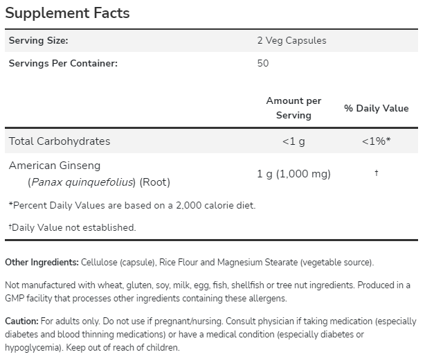 500 mg Adaptogenic Herb American Ginseng (Panax quinquefolius) has been used by traditional herbalists for centuries. Recent scientific data confirm the presence of bioactive compounds in American Ginseng, known as Ginsenosides, which confer this herb's adaptogenic properties.