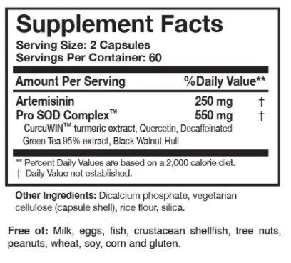 Artemisinin SOD combines pure artemisinin for immune support and green tea extract to promote healthy levels of SOD (superoxide dismutase). Curcumin and Quercetin for their healthy impact on inflammation and resulting inhibitory affect on NF kappa B, and black walnut hull to arm the body’s anti-parasitic arsenal.