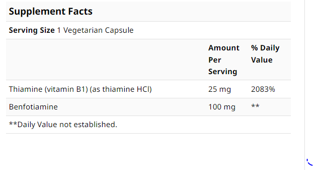 | Thiamine (vitamin B1) (as thiamine HCl) | 25 mg | 2083% |