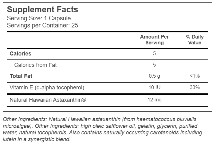 Other ingredients: Natural Hawaiian astaxanthin (from haematococcus pluvialis microalgae), high oleic safflower oil, gelatin, glycerin, purified water, natural tocopherols. Also contains naturally occurring carotenoids including lutein in a synergistic blend.