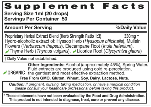 | Hydro-alcoholic extract of: Hyssop Herb (Hyssopus officinalis) Mullein Flowers (Verbascum thapsus) Elecampane Root (Inula helenium) Thyme Herb (Thymus vulgaris) Licorice Root (Glycyrrhiza glabra) | † |