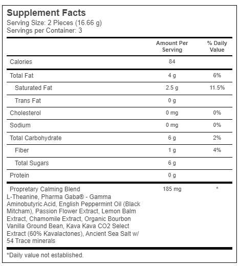 Other ingredients: L-Theanine, Pharma Gaba® - Gamma Aminobutyric Acid, English Peppermint Oil (Black Mitcham), Passion Flower Extract, Lemon Balm Extract, Chamomile Extract, Organic Bourbon Vanilla Ground Bean, Kava Kava CO2 Select Extract (60% Kavalactones), Ancient Sea Salt w/ 54 Trace minerals