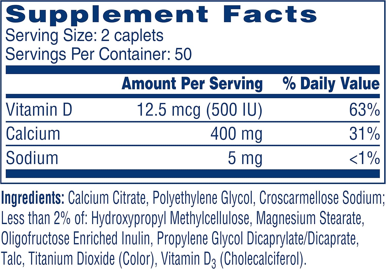 Product Benefits: 400 mg of calcium per serving in the form of calcium citrate to help support bone health 12.5 mcg (500 IU) of Vitamin D3 per serving to help your body absorb calcium Gentle on your digestive system Can be taken with or without food Adults and children ages 12 years of age and older Directions: Adults and children 12 years of age and older: Take 1serving (2 caplets) twice daily with or without food or as...