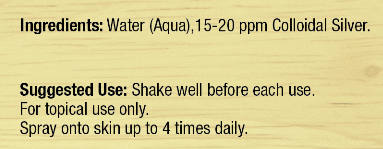 Ingredients: Water (Aqua), 15-20 ppm Colloidal Silver.