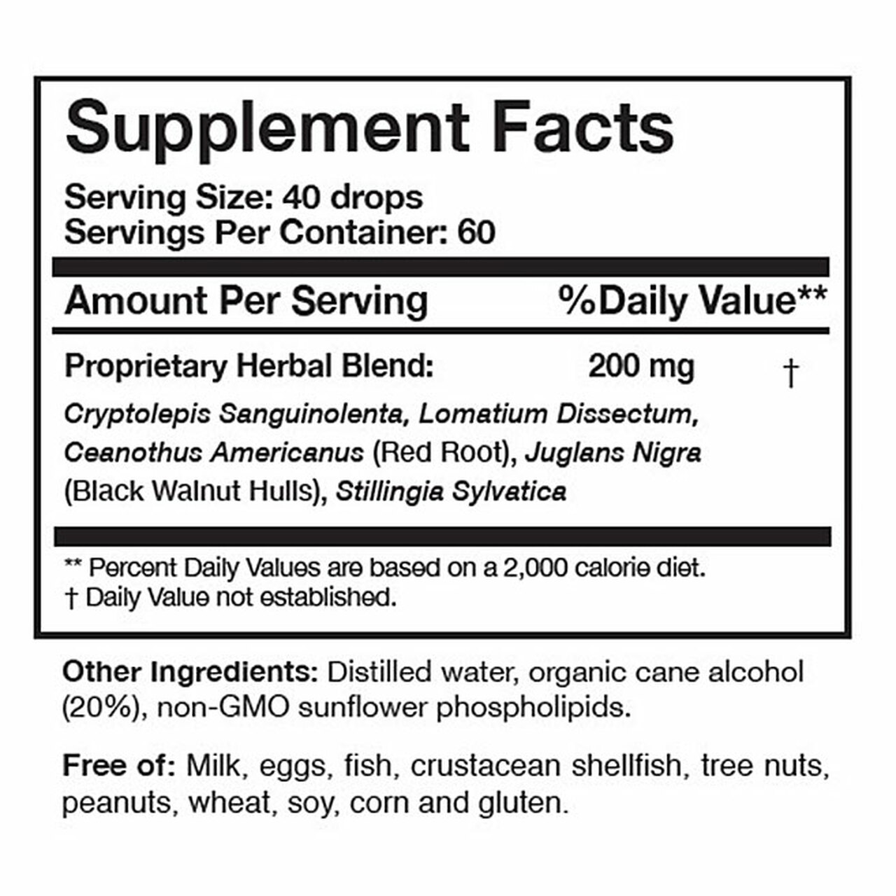 | Proprietary Herbal Blend: Cryptolepis Sanguinolenta, Lomatium Dissectum, Ceanothus Americanus (Red Root), Juglans Nigra (Black Walnut Hulls), Stillingia Sylvatica |