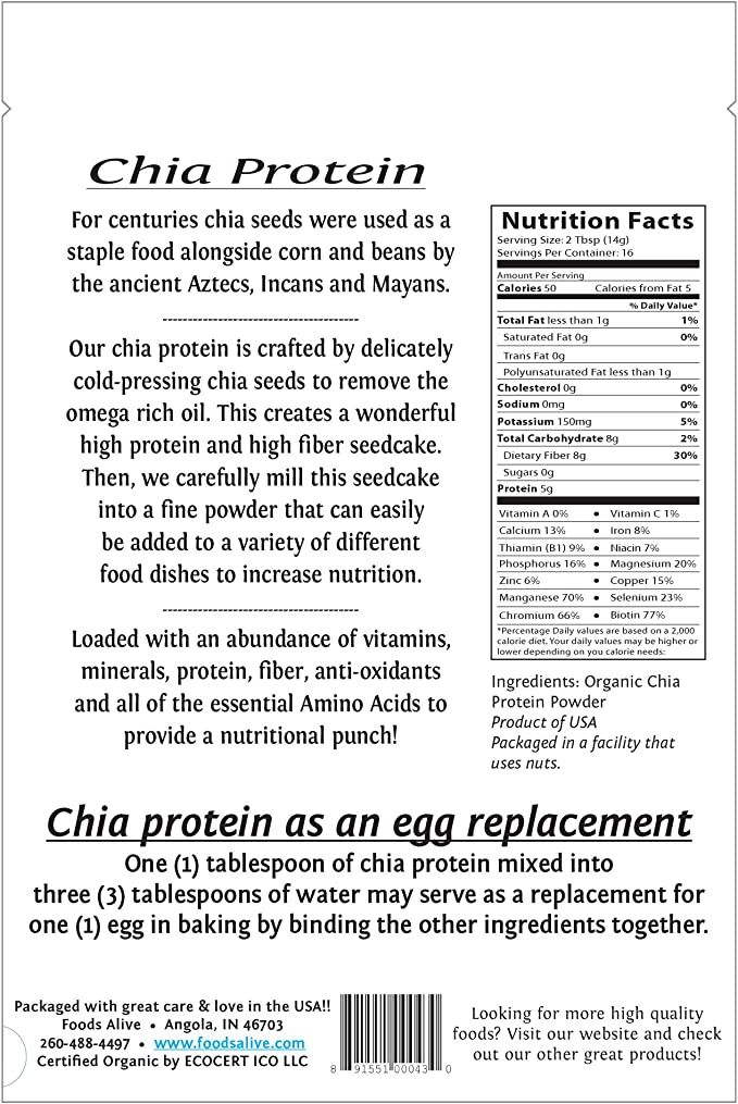 Suggested Use: One (1) tablespoon of chia protein mixed into three (3) tablespoons of water may serve as a replacement for one (1) egg in baking by binding the other ingredients together.