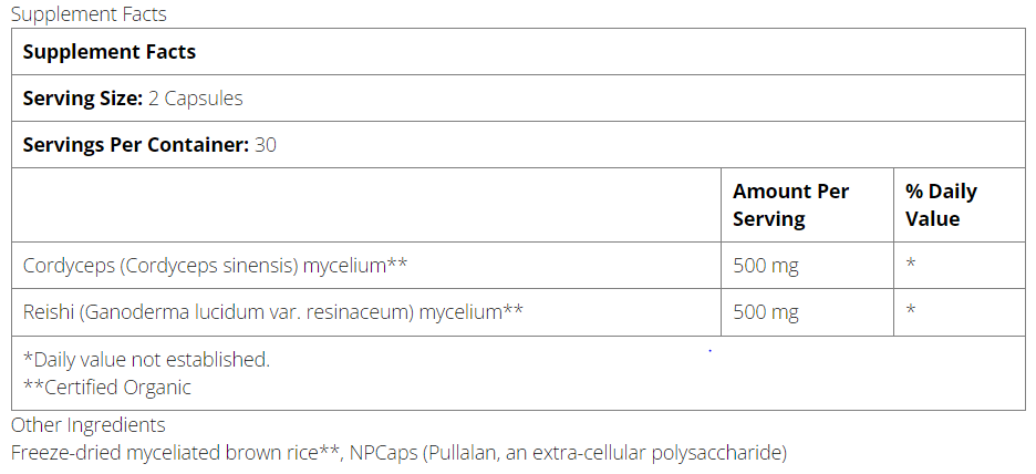 Other Ingredients: Freeze-dried myceliated brown rice**, NPCaps (Pullulan, an extra-cellular polysaccharide)