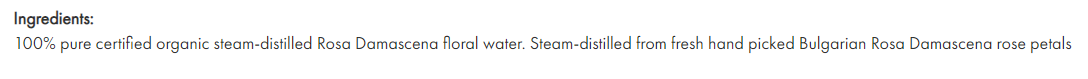 Other ingredients: 100% pure certified organic steam-distilled Rosa Damascena floral water.