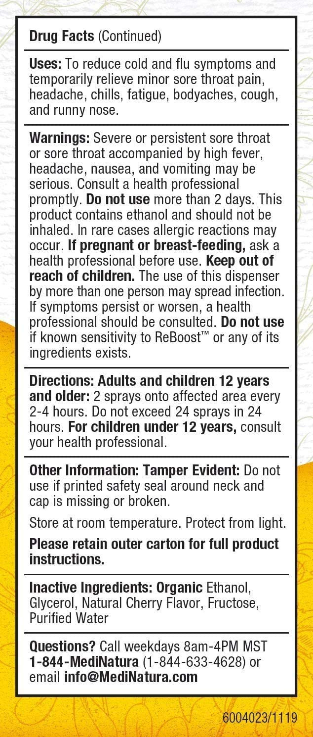 Warnings: Severe or persistent sore throat or sore throat accompanied by high fever, headache, nausea, and vomiting may be serious. Consult a health professional promptly. Do not use more than 2 days. This product contains ethanol and should not be used in rare cases allergic reactions may occur. If pregnant or breastfeeding, ask a health professional before use. Keep out of reach of children. Do not use if sensitivity to ReBoost™ or any of its ingredients exists.