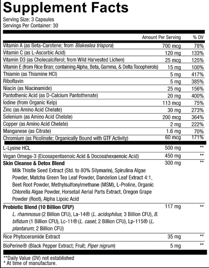 Skin vitamins & minerals: All-in-one formula featuring vegan vitamin A as 100% Beta-Carotene, vitamin C, vitamin D3 from wild harvested lichen, and vitamin E from rice bran.
