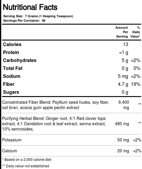 | Concentrated Fiber Blend: Psyllium seed husks, soy fiber, oat bran, acacia gum apple pectin extract | 6,400 mg |