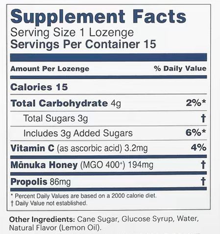 Given by Nature, Proven by Science.These lozenges are a convenient immune booster and instantly soothe a dry, scratchy throat. They combine the goodness of premium New Zealand Manuka Honey with the support of Vitamin C and the protective power of Propolis.Made with our high grade MGO 400+ Manuka Honey, certified for natural methylglyoxal content (400mg/kg). With Protecting PropolisSupport Immunity100% Natural with Vitamin C...