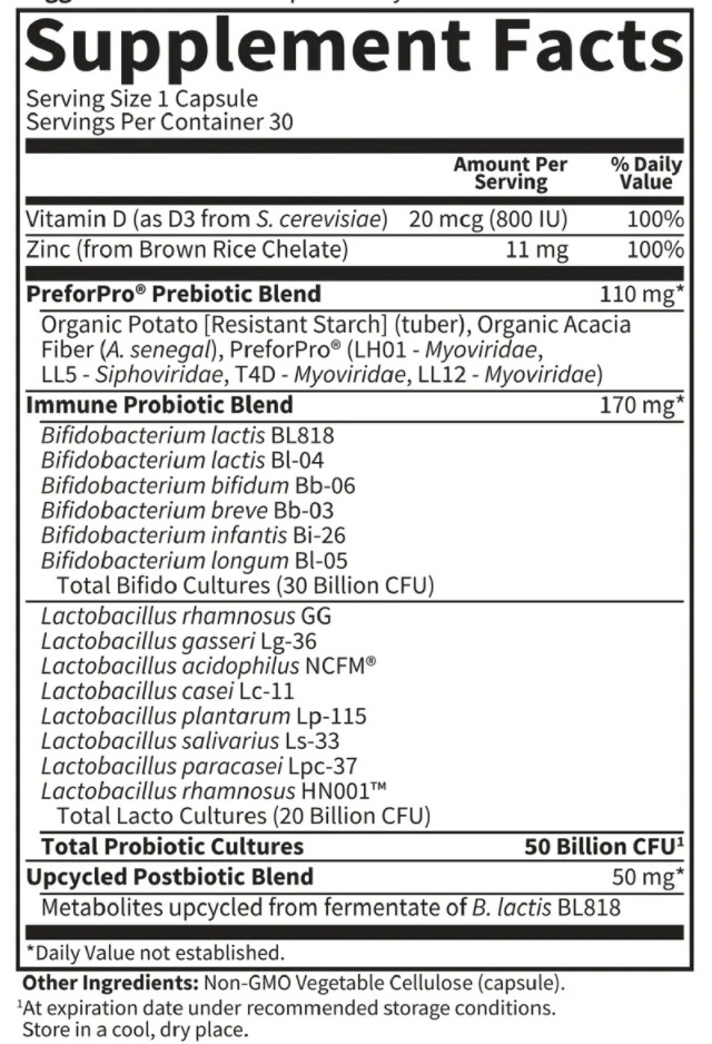 This is a powerful triple-action formula for those looking to support their immune system and digestive health.† Dr. Formulated Probiotics Immune† is special since it not only contains 50 Billion CFU of diverse strains per serving, but also provides a prebiotic blend to promote the growth of good bacteria—super important to support a healthy microbiome.† Dr. Formulated Probiotics Immune† contains an exclusive postbiotic blend to support Bifidobacteria growth also the good stuff. For additional immune support, there’s vitamin D3 plus zinc.† All of this means that you get powerful triple-action daily support for immune system and digestive health—all in one, easy-to-swallow capsule per day!†