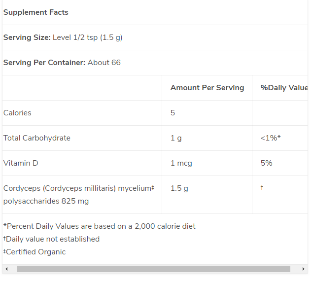 | Cordyceps (Cordyceps militaris) mycelium | 1.5 g | † |