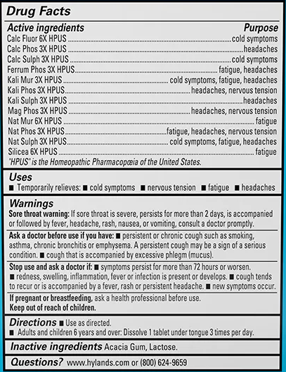 Relief of Colds, Headaches, and Simple Nervous TensionWhether suffering from colds, headaches, nervous tension, or fatigue, your body may be lacking key minerals. Each Hyland’s Bioplasma tablet contains the 12 cell salts that your system needs to restore a necessary balance that will bring symptom relief. You can count on Hyland's for relief of symptoms of colds, simple nervous tension, fatigue and headaches. Tablets are fl...