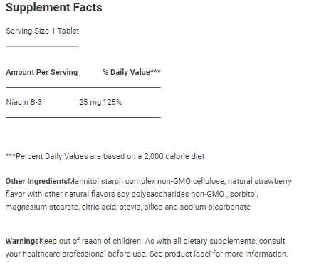 Natural strawberry flavored micro tablets melt quickly in the mouth and are designed for optimal absorption in the body. Niacin provides nutritive support for the normal, healthy metabolism of carbohydrates, protein, and fat for energy, as well as maintaining the integrity of the skin, nerves, and digestive tract.