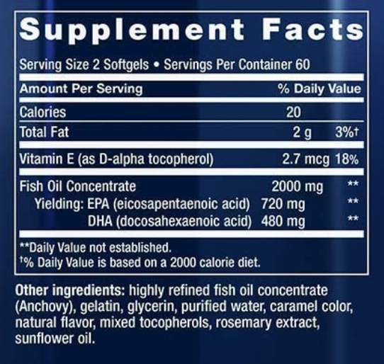 Other ingredients: highly refined fish oil concentrate (Anchovy), gelatin, glycerin, purified water, caramel color, natural flavor, mixed tocopherols, rosemary extract, sunflower oil
