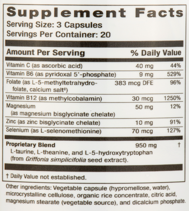TravaCor provides support for the calming neurotransmitter system utilizing a unique combination of amino acids and vitamin and mineral cofactors. It contains the amino acid L-theanine‚ which has been widely studied for its ability to produce a calming effect and prevent over-stimulation. 5-HTP is included to support the production of serotonin‚ which is the precursor to melatonin. This formula also includes taurine‚ which ...