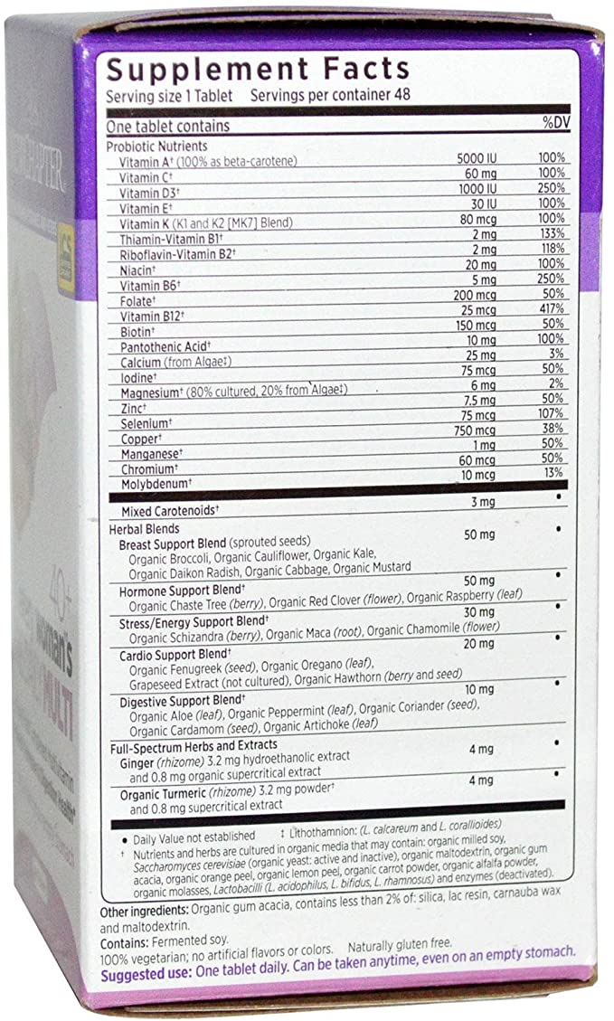 Every Woman's One Daily 40+ Multivitamin is a fermented multivitamin including Vitamins D3, C, K2, and complementary herbs like Organic Chaste Tree Berry, Red Clover, and Raspberry Leaf, created specifically to meet the needs of women 40+. The multivitamin promotes overall health and system-specific benefits. It aids in hormone health, bone strength, and digestive support.