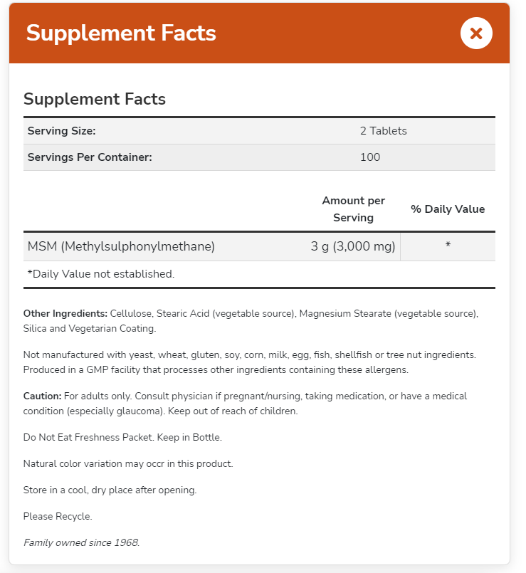 | MSM (Methylsulphonymethane) | 3 g (3,000 mg) | * |