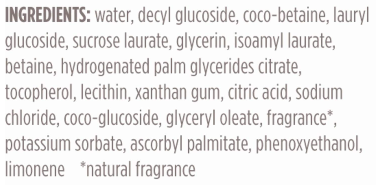 Other ingredients: water, decyl glucoside, coco-betaine, lauryl glucoside, sucrose laurate, glycerin, isoamyl laurate, betaine, hydrogenated palm glycerides citrate, tocopherol, lecithin, xanthan gum, citric acid, sodium chloride, coco-glucoside, glyceryl oleate, fragrance*, potassium sorbate, ascorbyl palmitate, phenoxyethanol, limonene.