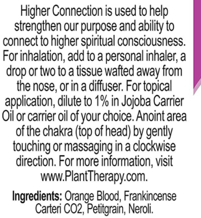 - RECOMMENDED USAGE: Add Higher Connection to a personal inhaler, a drop or two to a tissue wafted away from the nose, or in a diffuser. For topical applications, dilute to 1% in Jojoba Carrier Oil or your favorite Plant Therapy carrier oil. Anoint area of the chakra by gently touching or massaging in a clockwise direction.