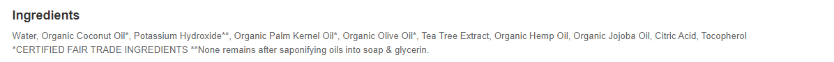 | Water, Organic Coconut Oil*, Potassium Hydroxide**, Organic Palm Kernel Oil*, Organic Olive Oil*, Tea Tree Extract, Organic Hemp Oil, Organic Jojoba Oil, Citric Acid, Tocopherol |