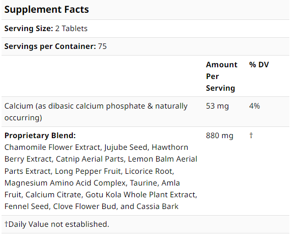| Proprietary Blend: Chamomile Flower Extract, Jujube Seed, Hawthorn Berry Extract, Catnip Aerial Parts, Lemon Balm Aerial Parts Extract, Long Pepper Fruit, Licorice Root, Magnesium Amino Acid Complex, Taurine, Amla Fruit, Calcium Citrate, Gotu Kola Whole Plant Extract, Fennel Seed, Clove Flower Bud, and Cassia Bark | 880 mg | † |