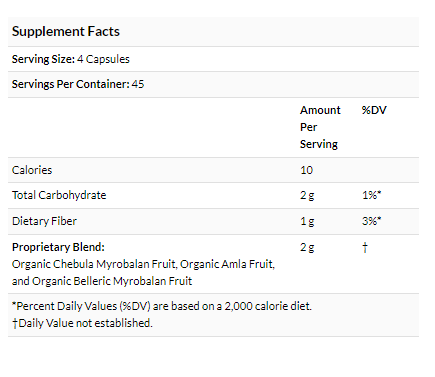 Other Ingredients: Organic Chebula Myrobalan Fruit, Organic Amla Fruit, and Organic Belliric Myrobalan Fruit