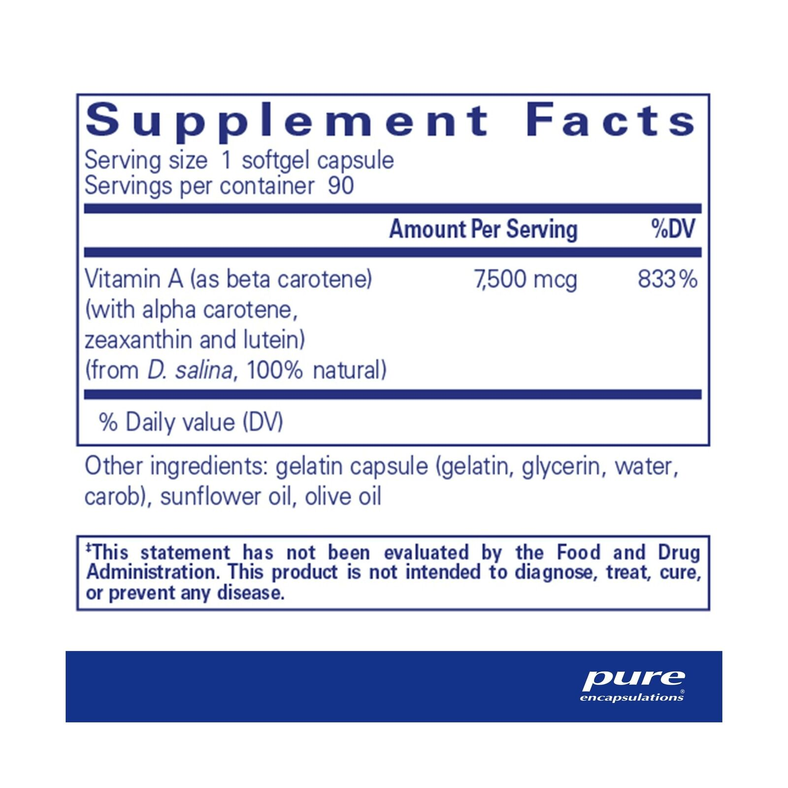 | Vitamin A (as beta carotene) (with alpha carotene, zeaxanthin and lutein) (from D. salina, 100% natural) | 7,500 mcg | 833% |
