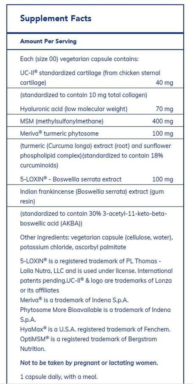 Joint Complex supports joint function and comfort by combining ingredients that operate as cartilage building blocks and herbal extracts into one convenient once-daily capsule. Joint Complex also supports tissue hydration and joint lubrication.