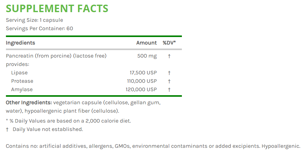 Pancreatic Enzyme Formula is designed to aid the bodys natural digestive process. Pancreatic Enzyme Formula provides enzymes that are naturally secreted by the pancreas and are essential to the digestion of food and absorption of nutrients. Provides digestive support Supports optimal digestion of food and absorption of nutrients Made with hypoallergenic ingredients This formula is designed to aid the bodys natural digesti...