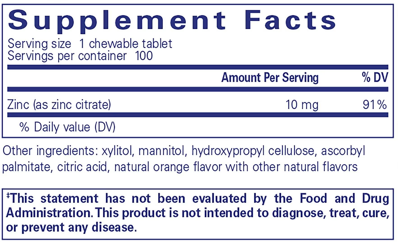 Benefits & Features Offers broad physiological support, including immune function and emotional wellness Great-tasting zinc chewable tablet Natural orange flavor Indications Ages 4 and up Support for immune function and emotional wellness Suggested Use As a dietary supplement, take 1 tablet, 1-3 times daily.