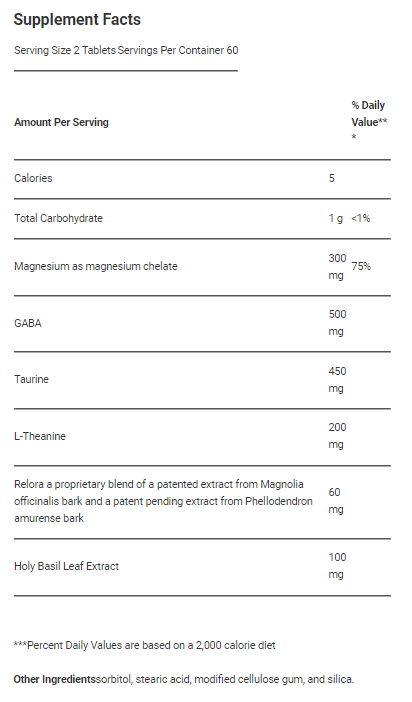 Serene Science Theanine Serene with Relora contains the amino acid L-theanine to support relaxation and focused attention, and the calming neurotransmitter GABA. Taurine can support the movement of potassium out of neurons which may help prevent overexcitation of neurons. It also features magnesium to support muscle and nerve relaxation, calming holy basil leaf extract and Relora to gently soothe away the tension in your bo...