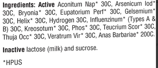 Comprehensive Homeopathic Flu Remedy Formulated by Dr. Theresa Dale Indications: To reduce the duration and severity of all flu symptoms. Suggested use Adults take one capful and children 2 years and over take 4 pellets: Dissolve pellets in mouth every 6 hours, up to 4 times per day. Take 20 minutes before or after food or liquid. Children under 2 years, consult your health care professional before use.