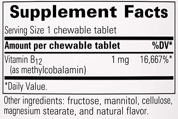 Each tablet of B12 Active contains 1 mg of vitamin B-12. Thoroughly chew one cherry-flavored tablet each day‚ with or without a meal; chew completely before swallowing. One bottle contains a one-month supply of chewable tablets‚ for those who find it difficult to swallow capsules.