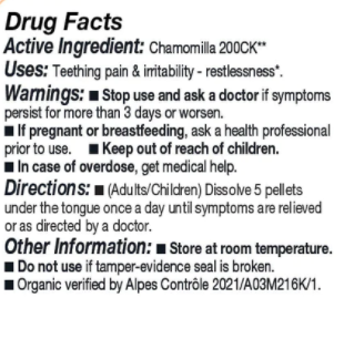 Product Description: Stay calm, cool, and collected with Chamomilla 200CK, traditionally used for teething, irritability, and restlessness Organic verified by Alpes Contrle 2021/A03M216K/1 Made in France Lactose-Free Organic Gluten-Free