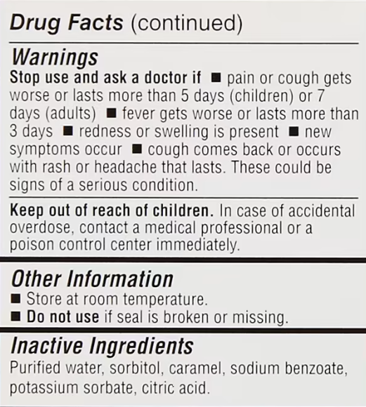 Warnings: Stop use and ask a doctor if pain or cough gets worse or lasts more than 5 days (children) or 7 days (adults), fever gets worse or lasts more than 3 days, redness or swelling is present, new symptoms occur, cough comes back or occurs with rash or headache that lasts. These could be signs of a serious condition.