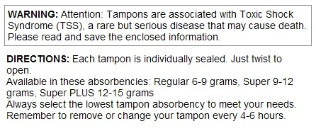 Warning: Attention: Tampons are associated with Toxic Shock Syndrome (TSS), a rare but serious disease that may cause death. Please read and save the enclosed information.