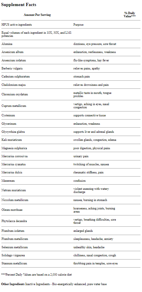 King Bio Dr. King's Heavy Metal Detox temporarily relieves symptoms due to heavy metal toxicity: exhaustion, drowsiness, confusion, nausea, twitching muscles, swollen glands, stomach pain, vertigo, headache, chilliness, sore throat, unhealthy skin, cough, poor digestion, rheumatic stiffness, physical pains, sleeplessness, and hay fever symptoms. AquaFlora Candida Heavy Metal Detox is formulated to balance heavy metal toxici...