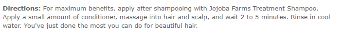 Directions: For maximum benefits, apply after shampooing with Jojoba Farms Treatment Shampoo. Apply a small amount of conditioner, massage into hair and scalp, and wait 2 to 5 minutes. Rinse in cool water. You've just done the most you can do for beautiful hair.