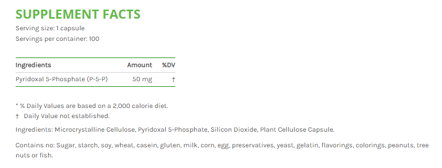 Other ingredients: Microcrystalline cellulose, Pyridoxal 5-Phosphate, Silicon Dioxide, Plant Cellulose Capsule.