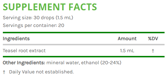 Teasel is a liquid extract made from Fuller’s teasel (Dipsacus fullonum) roots. It is a tall, perennial plant native to Eurasia and North Africa with multiple traditional uses.