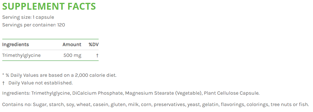 Other ingredients: Trimethylglycine, DiCalcium Phosphate, Magnesium Stearate (Vegetable), Plant Cellulose Capsule.