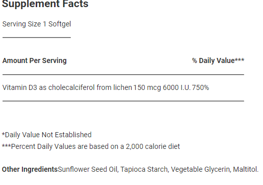 | Vitamin D3 as cholecalciferol from lichen | 150 mcg 6000 I.U. |