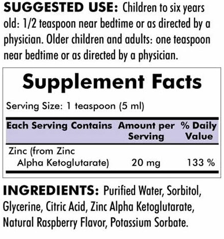 Other ingredients: Purified Water, Sorbitol, Glycerine, Citric Acid, Zinc Alpha Ketoglutarate, Natural Raspberry Flavor, Potassium Sorbate