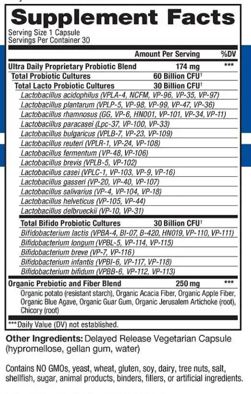 Formulated specifically for those seeking a high potency and high diversity daily probiotic 60 billion live cultures 60 vital probiotic strains 7 unique probiotic sources Contains 30 delayed release vegetable capsules A healthy gut contains a highly diverse balance of good microbes. Vital Flora contains multiple strains of Lacto and Bifide bacteria to more closely mirror the natural diversity of the human gut. Formulated ...