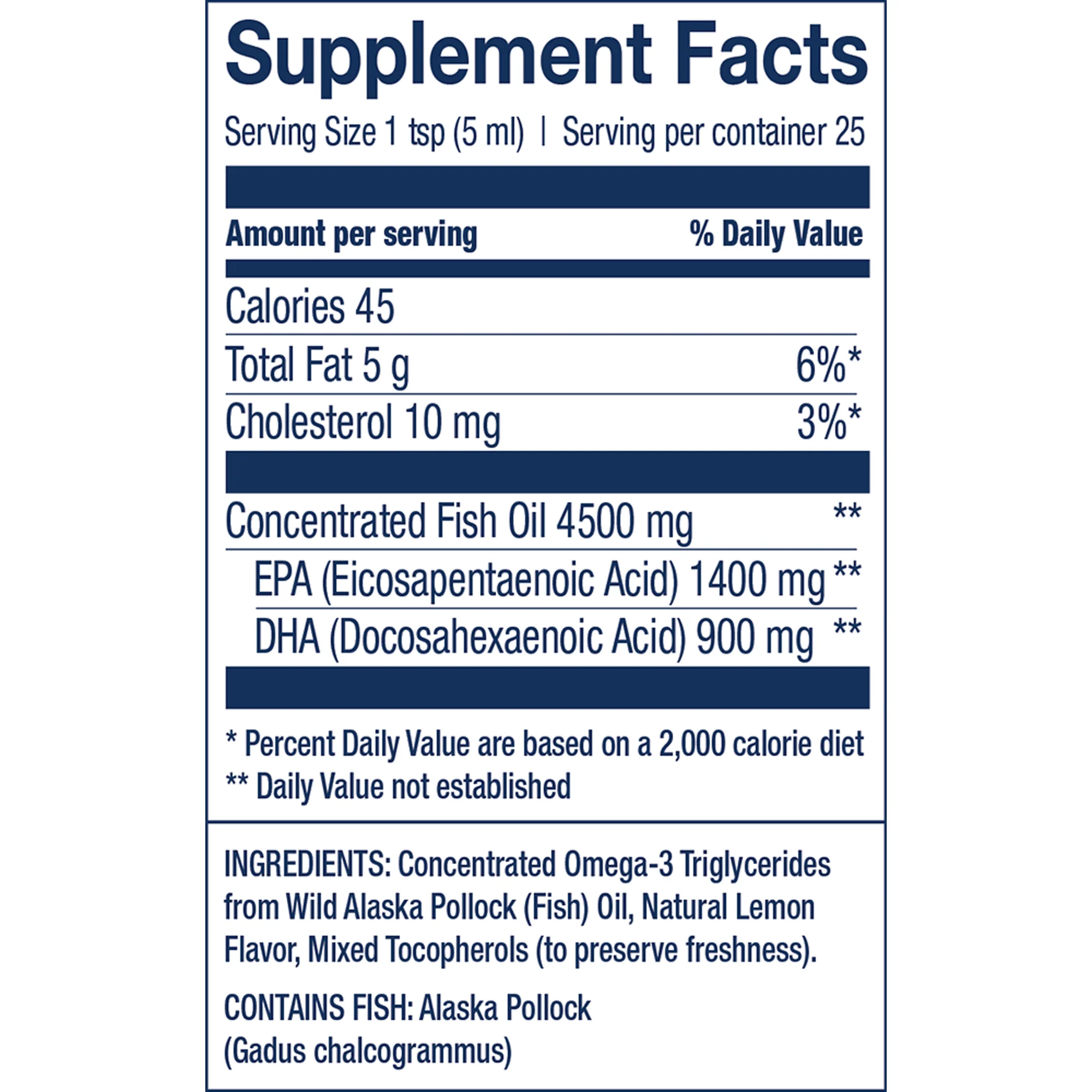 Ingredients: Concentrated Omega-3 Triglycerides from Wild Alaska Pollock (Fish) Oil, Natural Lemon Flavor, Mixed Tocopherols (to preserve freshness)