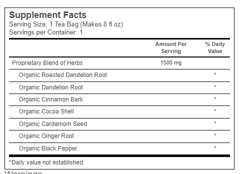 Yogi Roasted Dandelion Spice DeTox tea combines Roasted Dandelion and Dandelion Root, herbs traditionally used by herbalists to support the body's natural cleansing processes. Cocoa Shell and Yogi’s traditional warming spice blend add rich, complex flavor to this intriguing herbal tea blend. Enjoy a deliciously purposeful cup of Yogi Roasted Dandelion Spice DeTox tea to help you feel refreshed and in balance!